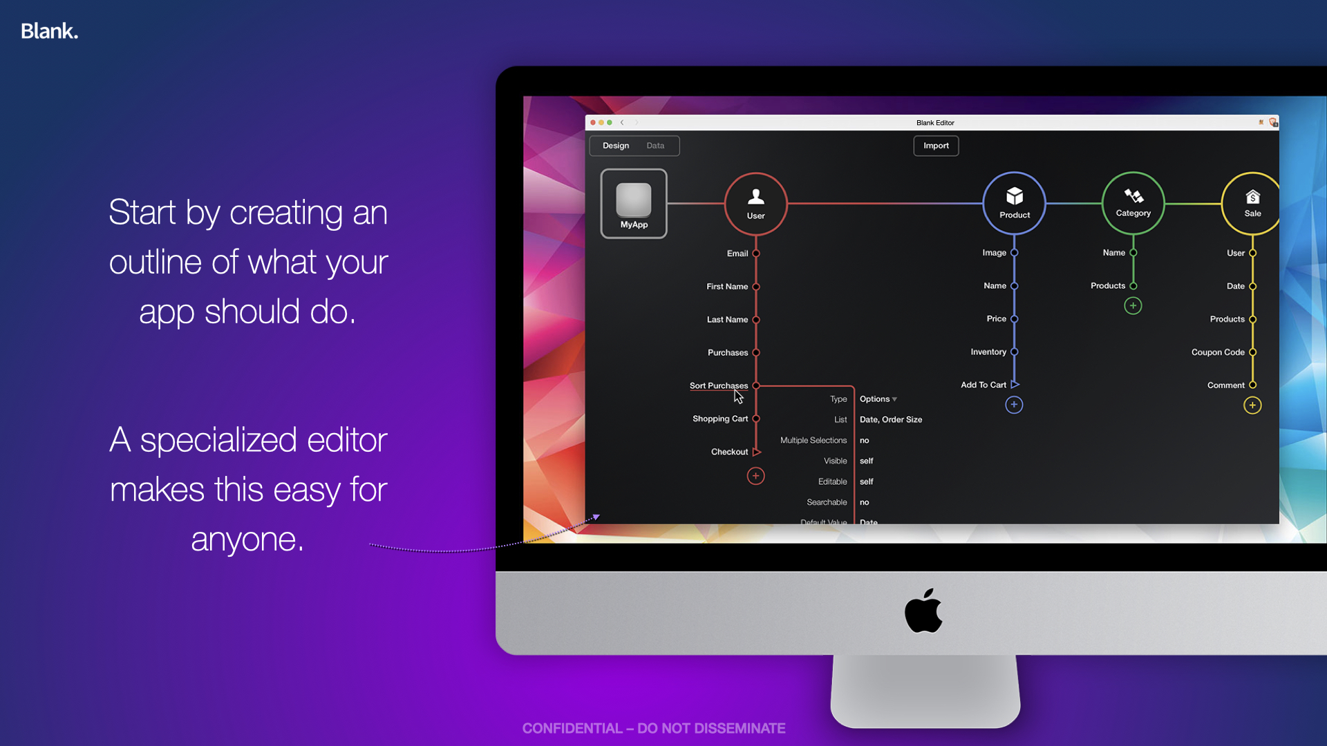 Blank was a project that was created before the explosion in low-code / no-code software generators. Most (all?) of the no-code tools that exist today feature some form of drag-and-drop editor. The purpose of blank was to avoid drag-and-drop and derive the user interface entirely by collecting clues about usage from the way the data in the app is organized.