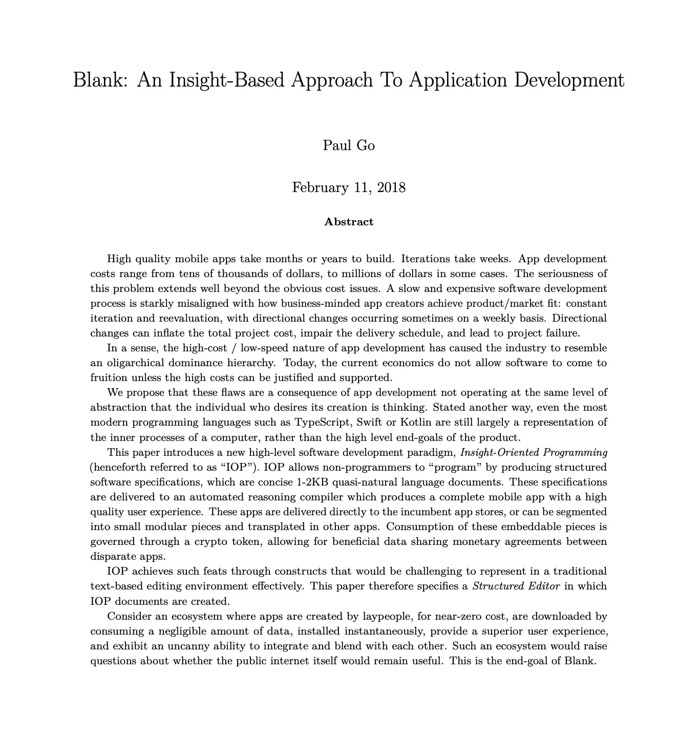 Blank was based on an internal research project that produced something which we called "Insight-Oriented Programming". This was a a form of programming that aspired to operate at the level of abstraction at which the average user is thinking. Below is the whitepaper I wrote to describe these findings: